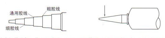 ? (3)根據(jù)密封面寬度和密封間隙來決定擠出膠條的直徑,選擇注膠嘴的尺寸,用刀截去,如下圖所示。用膠量不宜多,盡量減少擠出密封面之外的膠量;