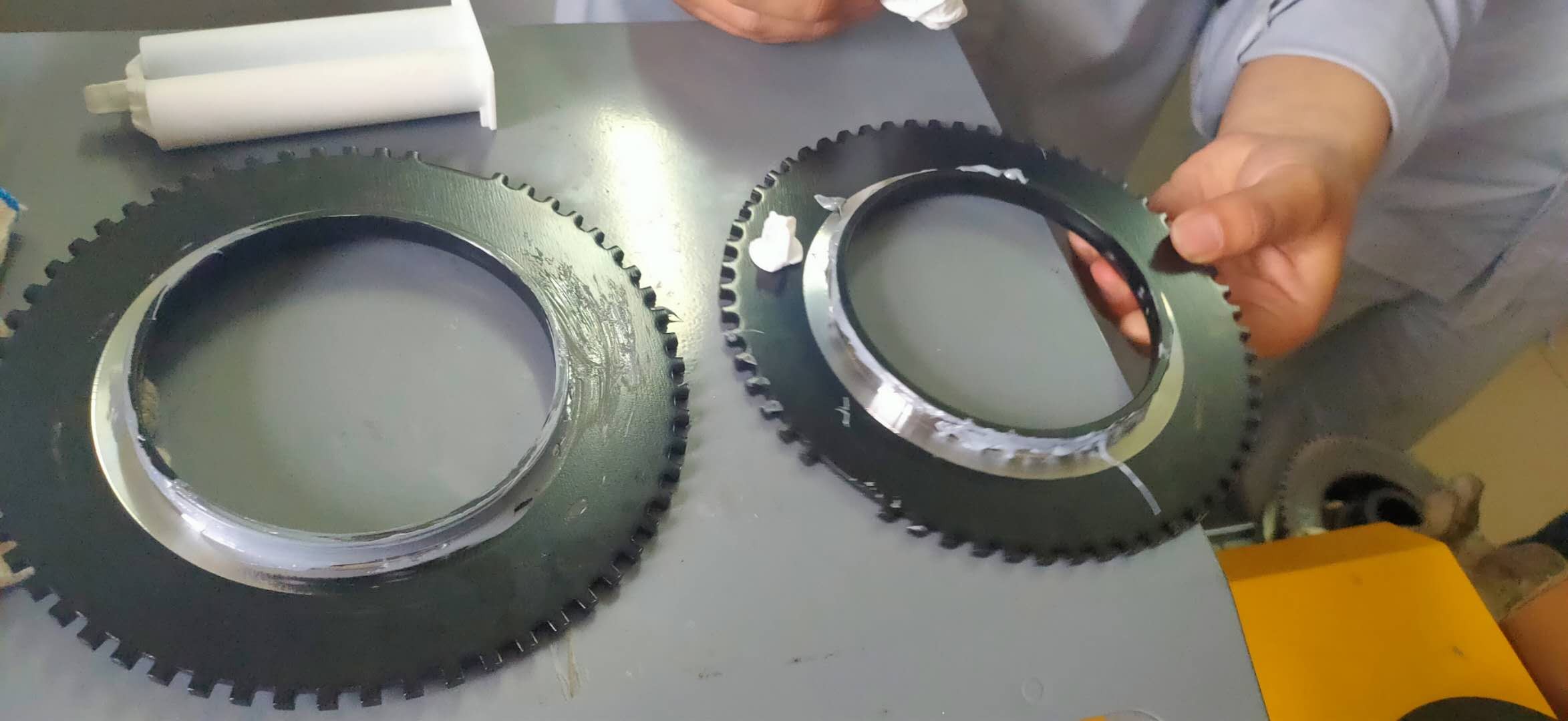 鑄工膠用在此地的目的是改進工藝以膠代螺栓,輪轂是QT450,盤子是SPHE鋼板,先涂膠水,再壓在一起,負(fù)間隙,過盈配合0.4mm要求粘接力強,并且要達到一定的粘接標(biāo)準(zhǔn),涂膠的過程中因為工況的特殊我們采用了針管裝的包裝加上混交嘴和膠槍,這樣涂膠的方式,大大節(jié)省了調(diào)膠的時間,以及涂膠不方便的問題,粘接完成后測試粘接強度,方可投入使用。